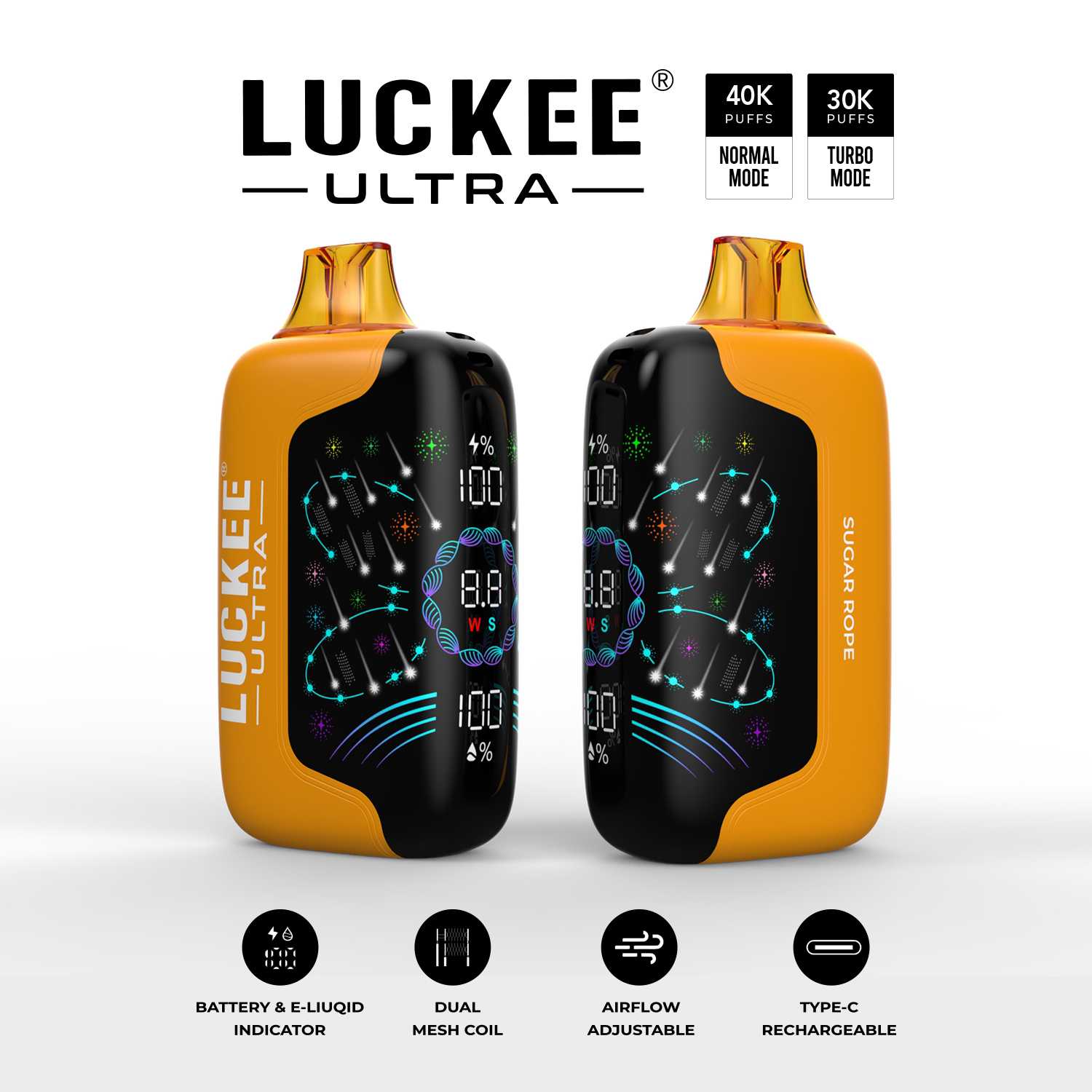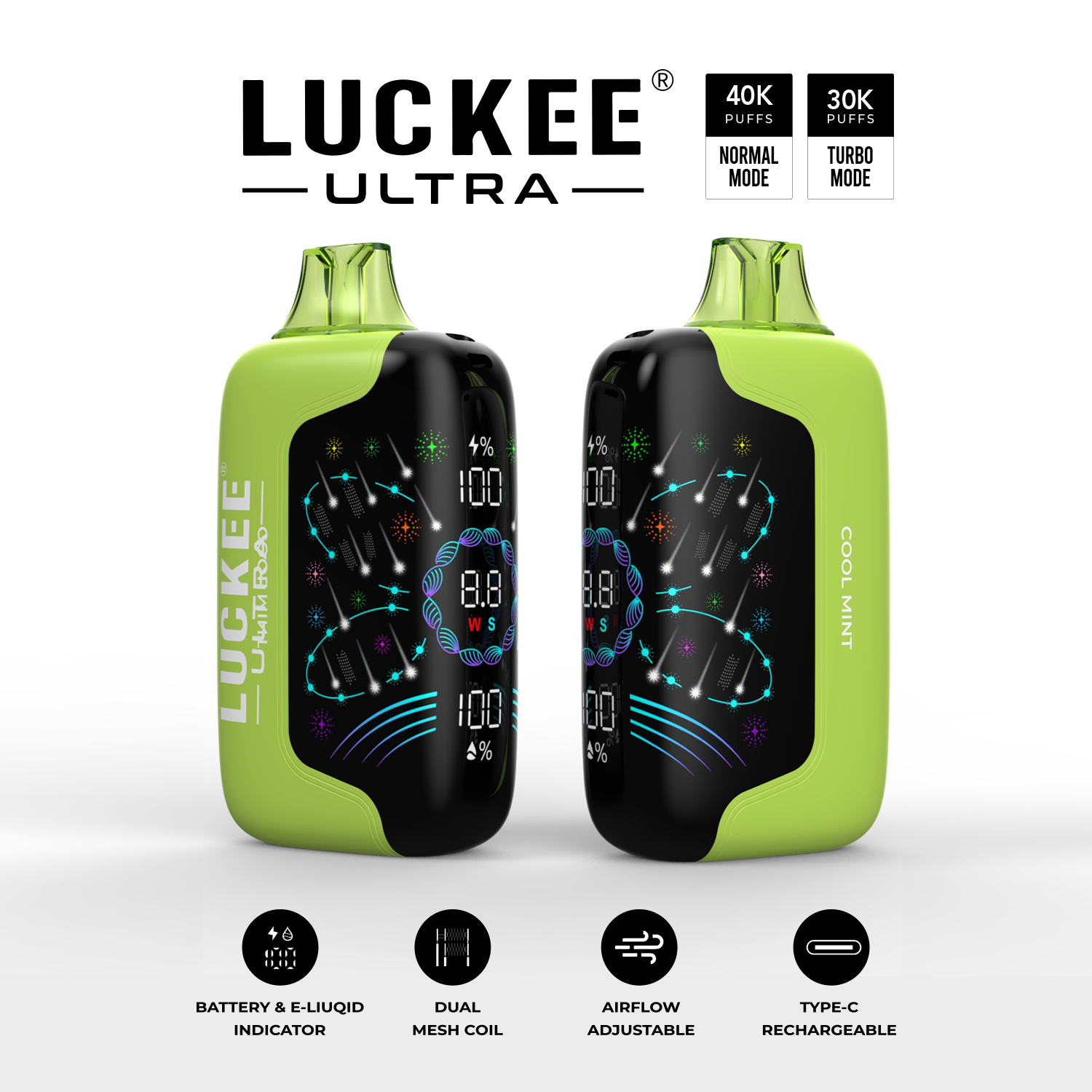 PARAMETERS Puffs: T:40000 puffs, N:30000puffs Liquid: 30ml e-liquid Flavors:12 flavors Battery:850mAh battery Charging port:Type-c Resistance:dual mesh coil Design:digital screen Weight: 110g/piece