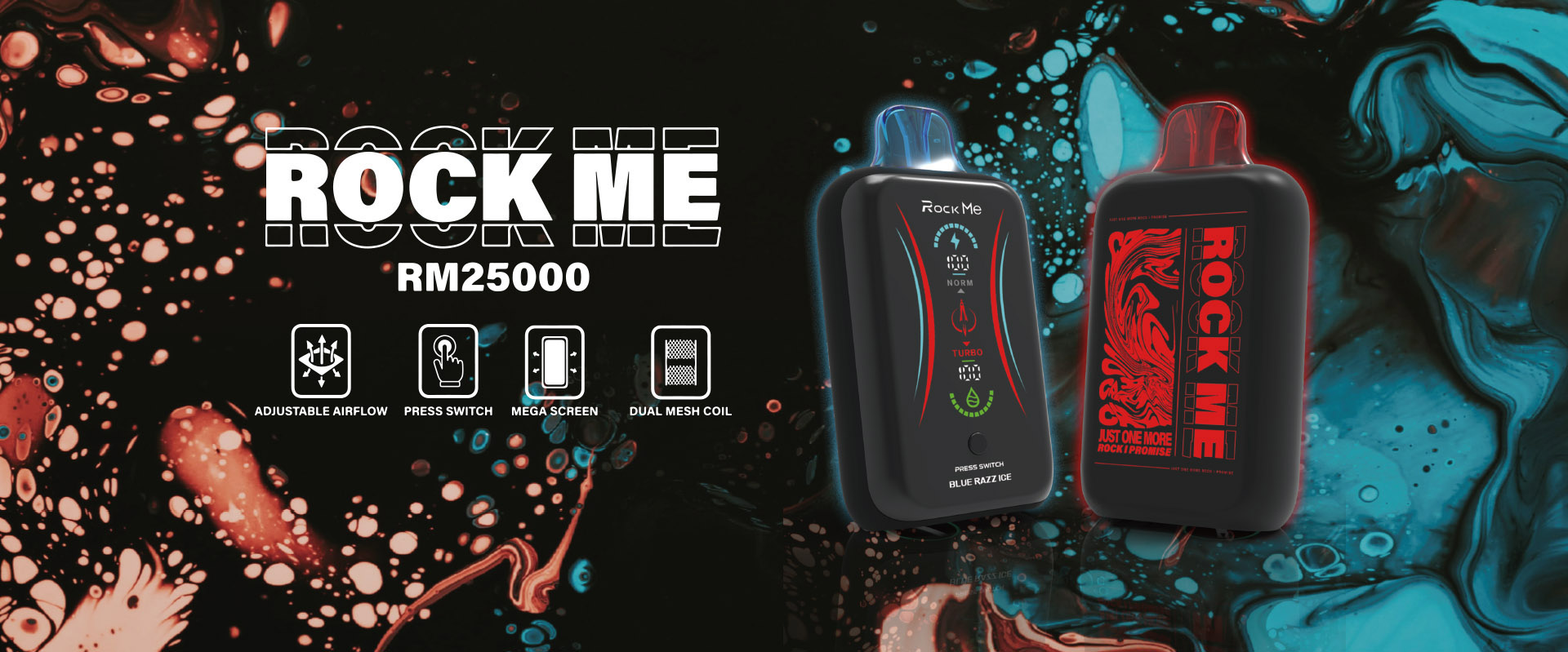 PARAMETERS Puff: Up to 25000 puffs Liquid: 28 mL Pre-filled Nicotine: 2% Battery: 650mAh Rechargeable Core: Mesh coil 1.2 Ω Charging port:Type-C Resistance: Dual Mesh Coil Design:Digital screen Flavor:17 flavors Weight: 115 g/piece