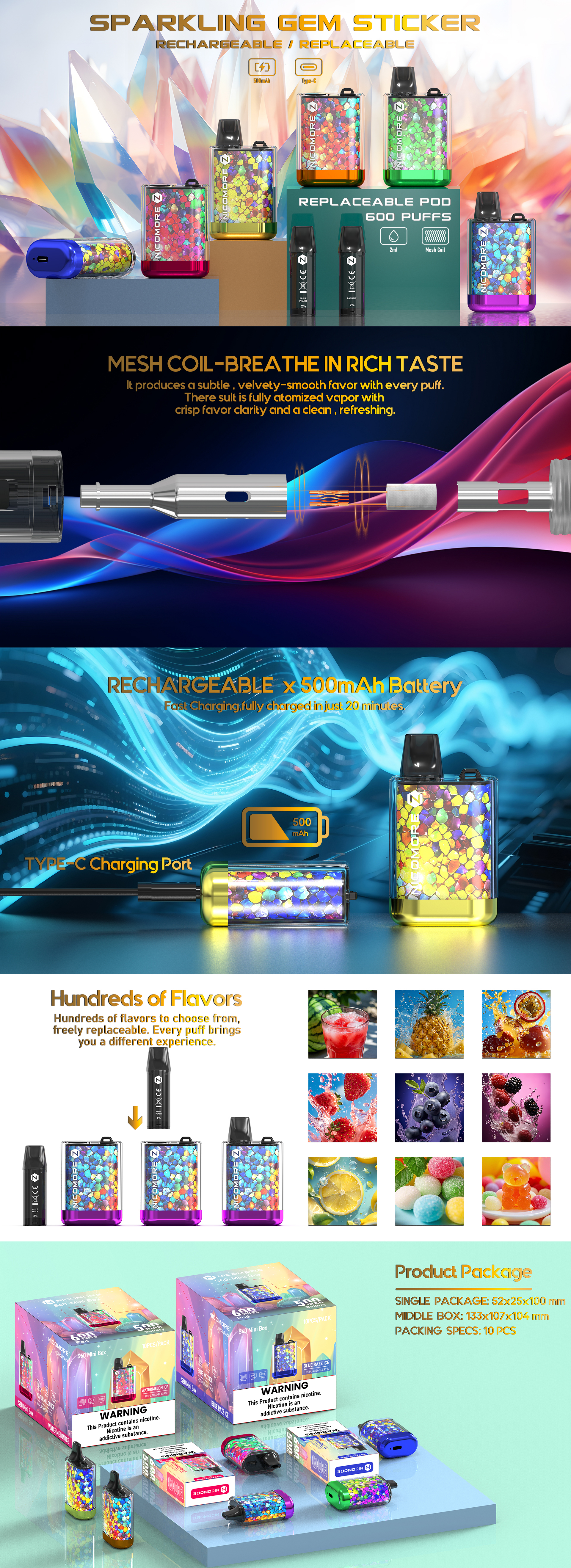 PARAMETERS Puff: 800PUFFS Nicotine:2% Liquid: 2 mL Battery:500MAH Charging port:Tyep-c Design:AIRFLOW ADJUSTABLE Weight: 70g/piece